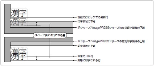 なお、改ページ後に残りの改行が行われた場合、印字データが有効印字領域の上端を越えると印字は行われません。