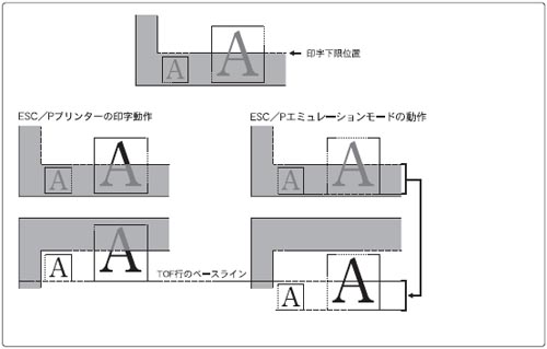本エミュレーションモードでは、ページフォーマットにかかわらず、縦倍文字が有効印字領域内に入っている場合は印字し、有効印字領域をはみ出す場合は、そのページに印字しません。