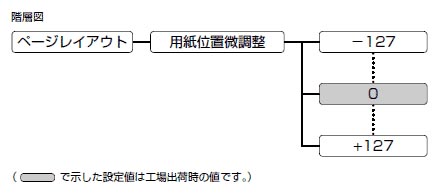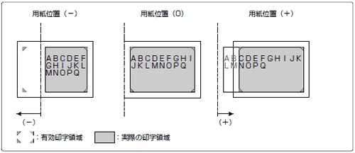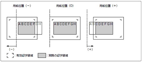 用紙の左端を基準として、印字位置を左右方向にずらす量を255段階で指定します。印字開始位置を左にずらす場合はプラス(+)方向、右にずらす場合はマイナス(-)方向になります。