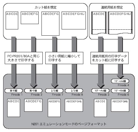 カット紙に対応したページフォーマットは、左端印字モードの印字動作と中央印字モードの印字動作をエミュレーションします。