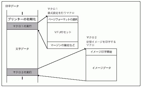 たとえば、ページの書式(ページ長やマージンなど)を決める一連の制御命令をマクロに登録しておけば、そのマクロを呼び出すだけで、いつも同じ書式で印字を行うことができます。また、同じイメージを印字する場合などは、その印字データをマクロに登録しておけば、印字のたびにイメージデータを送る必要がなくなります。