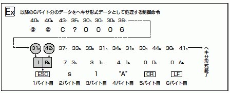 たとえば、PC-PR201/80Aの制御命令を使用して、スーパースクリプト文字で「A」と印字して復帰改行する場合、次のようなヘキサ形式のデータとなります。