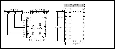 8ビット・ドット列イメージを印字した場合のPC-PR201/80Aでの印字結果は次のようになります。ただし、本エミュレーションモードでは、ドットの合間を埋めて印字します。