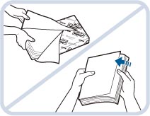 用紙をセットするときは、給紙されやすくするために数回さばき、用紙の端をそろえてください。また、包装紙を開いて取り出した用紙は、束ごとさばいてください。
