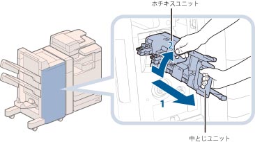1. 中とじユニットの取っ手を持ち、止まるまで引き出す |