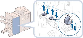 中とじユニット針カートリッジの交換を行う前に、製本トレイに排紙された用紙をすべて取り除いてください。