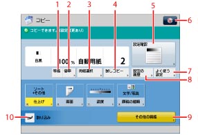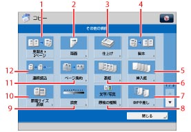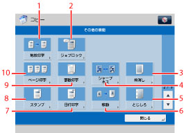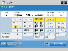 を押して画面を切り替えることができます。この画面にはコピーで利用できる応用機能が表示されます。