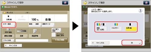 任意のカラーモードをデフォルト設定として使用したいときは、デフォルト設定の変更で登録できます。(→スキャンして保存の設定をする)