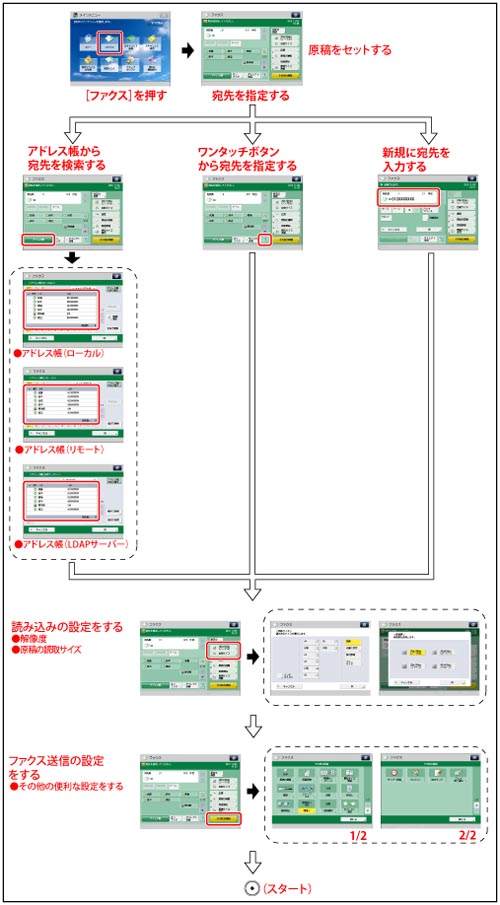 その他の機能を設定します。異なったサイズの原稿をいっしょに送信する場合や両面原稿を送信する場合など、便利なファクス送信機能を設定します。