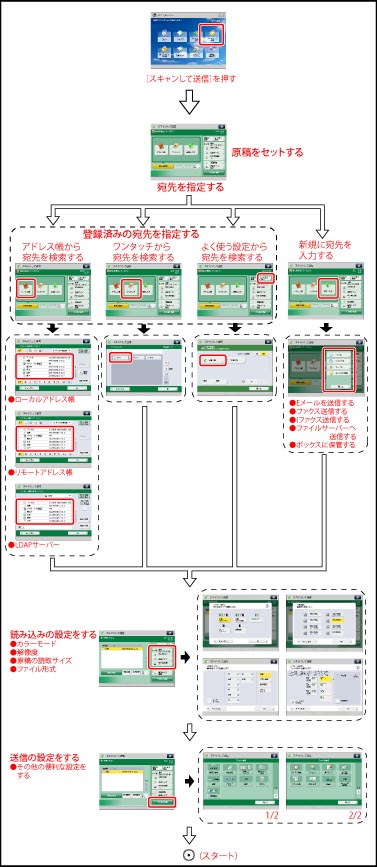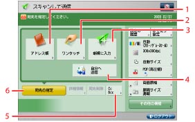 ファクスの宛先は、[ファクスファンクションの表示]の<「スキャンして送信」にファクスを表示>を「ON」に設定すると表示されます。(→ファクスファンクションを表示する)