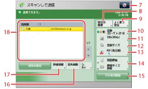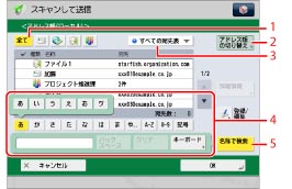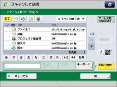 (Eメール)、 (ファクス)、 (ファイル)、 (グループ)、 (Iファクス)を押すと、それぞれの宛先を表示します。 |