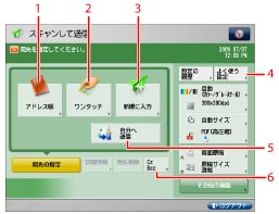 [新規宛先の制限]で新規宛先の入力制限が「ON」に設定されている宛先種別は、新規で宛先を入力できません。すでに登録されている宛先をローカルアドレス帳、リモートアドレス帳、LDAPサーバーから検索、または、ワンタッチから選択してください。(→新規宛先への送信を制限する)