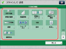 : Eメール : ファクス : Iファクス : ファイル : グループ : ボックス : Bcc : Cc |