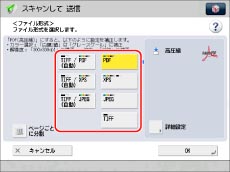 カラーモードが白黒2値のときはTIFF、フルカラーまたはグレースケールのときはJPEG形式で送信されます。送信画面では、「TIFF/JPEG」と表示されます。