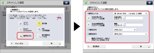 (スタート)を押したあとに表示される画面でパスワードを入力します。暗号化PDFの設定を、よく使う設定に登録できます。[文書を開くパスワード]、[権限パスワード]を[よく使う設定]にしたくないときは、パスワードを空欄に設定できます。