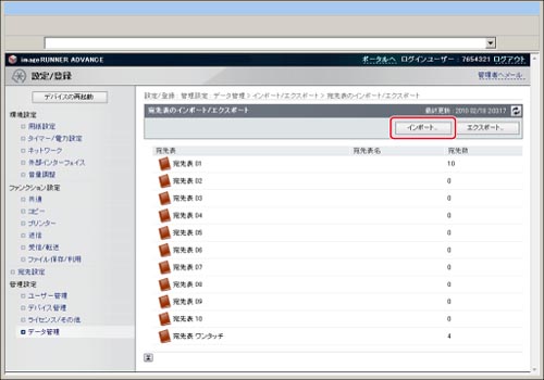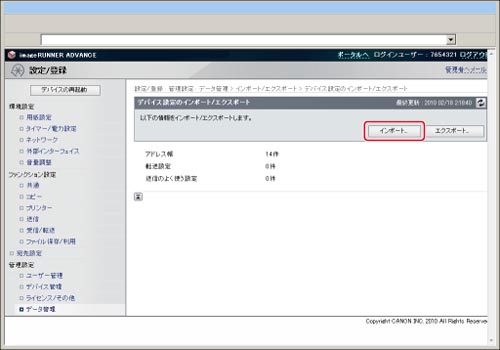 デバイス設定をインポートすると、宛先表も同時にインポートされ、登録されている宛先が削除されて読み込んだファイルの内容で上書きされます。