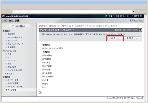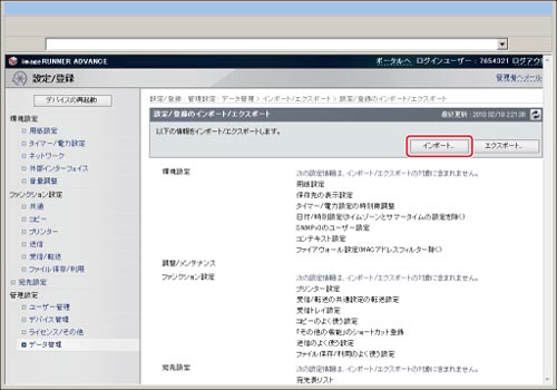 設定/登録のインポート後は、本製品の主電源スイッチを入れなおすまでリモートUIからの操作を行うことができません。一度本製品の主電源を切り、もう一度電源スイッチを入れなおします。