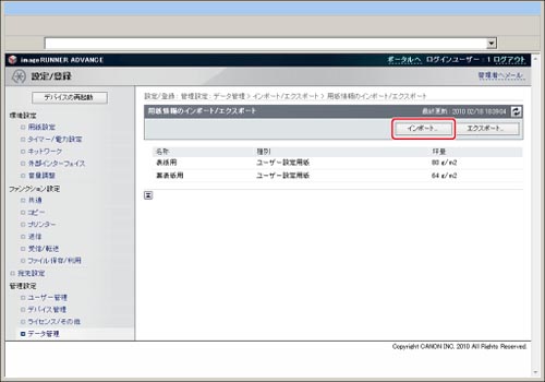 imageRUNNER ADVANCE 4045/4045F/4035/4035F/4025/4025F以外の機種でエクスポートしたデータは、インポートできません。同じオプション構成のimageRUNNER ADVANCE 4045/4045F/4035/4035F/4025/4025Fシリーズの機種へ保存データをインポートできます。