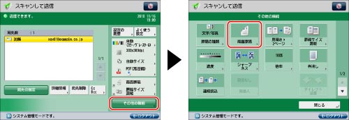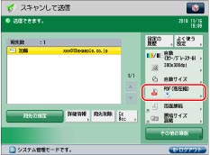 例) 両面原稿をスキャンして、相手先にファイル形式を高圧縮PDFに設定したEメールを送信する場合: