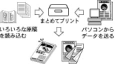 スキャナー部から取り込んだ紙文書データやコンピューターで作成したデータを保存できます。保存されたデータは、必要なときにプリントしたり、別べつに保管されているデータやコンピューターで作成したデータとまとめてプリントしたりできます。