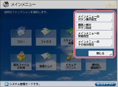 ファンクションボタンの数が<メインメニューのボタン表示設定>で設定されたレイアウトボタン数より多い場合は、メインメニュー画面の2ページ目以降に表示されます。メインメニュー画面に表示できるボタン数は最大16個です。
