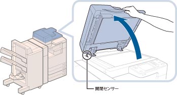 本製品にはフィーダーの開閉センサーが装着されています。原稿台ガラスに原稿をセットする場合は、フィーダーをセンサーから離れる位置まで(約30cm)開いてください。センサーが一度離れないと、原稿サイズを正しく検知できないことがあります。