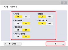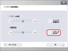 (音量調整)を押して、ファクス送信・受信のアラーム音量と通信音量を調整できます。また、ファクス着信時の呼び出し音を設定したり、操作やデバイスの状態に応じてさまざまな種類のブザーが鳴るように設定できます。
