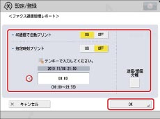 ファクス通信管理レポートを自動でプリントする場合は、40件の文書の送信/受信が終了した時点でプリントするか、指定した時刻にプリントするかを選択できます。また、送信/受信別にプリントすることもできます。