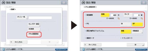 IPSec通信をFIPS 140-2に準拠させた場合は、認証方式に[ESP(AES-GCM)]を設定しているポリシーは無効(OFF)になります。同時に、このポリシーの認証アルゴリズムはSHA1へ、暗号アルゴリズムは3DES-CBCへ自動的に変更されます。(→FIPS 140-2に準拠した暗号方式を使用する)