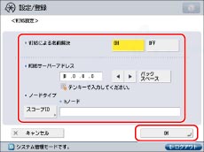 WINSの名前解決を使用するときは、<WINSによる名前解決>の[ON]を押します。[WINSサーバーアドレス]にWINSサーバーのIPアドレスを入力してください。