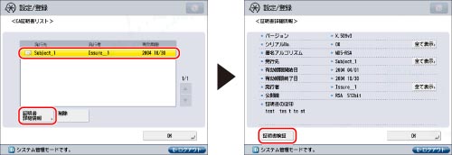 詳細を確認したいCA証明書を選択→[証明書詳細情報]→[証明書検証]を押す