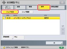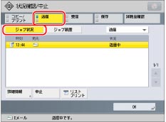 選択したジョブを中止します。[中止]はファクスジョブ選択時に表示されます。[中止]→[はい]を押すとジョブが中止されます。