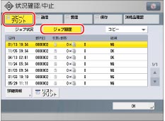 選択したジョブの詳細情報を表示します。表示された詳細情報を確認して、[OK]を押すとコピー/プリント画面に戻ります。
