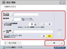 (テンキー)から、ボックスの番号を入力して指定する場合は、2桁のボックス番号を入力したあと、[OK]を押します。