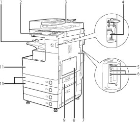 本製品を操作するのに必要なキーやタッチパネルディスプレー、ランプなどがあります。(→操作パネル各部の名称とはたらき)