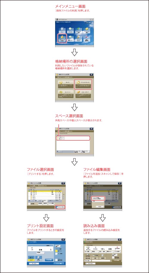 [ファイルを追加(スキャンして保存)]の操作および読み込み画面の操作手順については、「ファイルを追加する(スキャンして保存)」、「スキャンして保存の操作の流れ」を参照してください。
