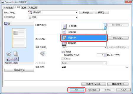 [印刷方法]から[両面印刷]を選択して、[OK]をクリックします。