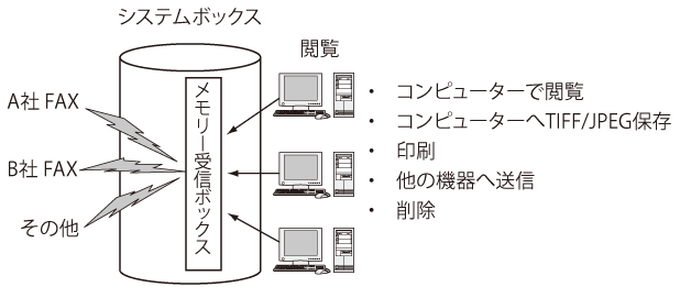 システムボックスの格納領域は「メモリー受信ボックス」と呼ばれます。すべてのメモリー受信文書は「メモリー受信ボックス」1箇所に集まるため、一元管理ができます。