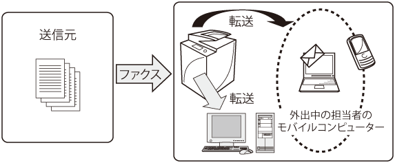 外出先でのメール受信を前提としたモバイルコンピューターがあれば、ファクス受信文書をEメールアドレスへ転送し、モバイルコンピューターで閲覧できます。
