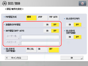 プロバイダーが「POP before SMTP」送信認証方式である場合は[ON]に設定します。