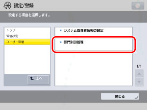 (設定/登録)→[管理設定]→[ユーザー管理]→[部門別ID管理]を押します。