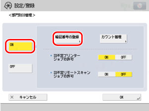 部門ID、暗証番号の設定をしたあと、[制限のON/OFFと制限面数の設定]を押します。