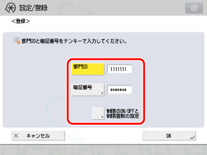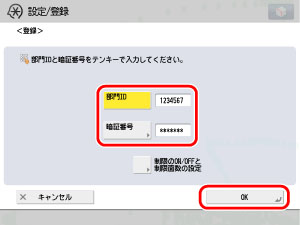 部門ID、暗証番号、確認入力を入力して[OK]をクリックします。