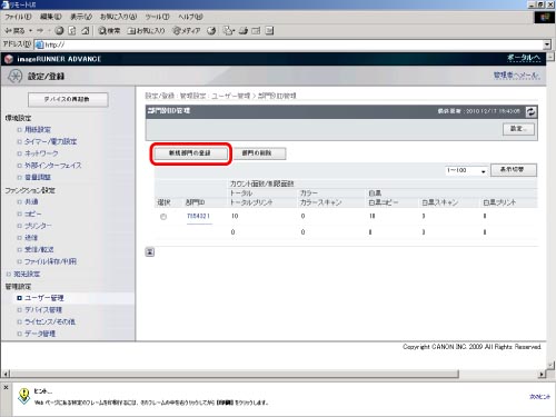 リモートUIにアクセスして、[設定/登録]→[ユーザー管理]→[部門別ID管理]をクリックしたあと、[新規部門の登録]をクリックします。