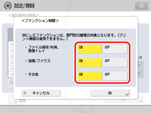 ファンクション制限とは、部門別ID管理の対象とする機能をコピー/プリント以外でON/OFF設定できる機能です。