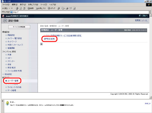 リモートUIにアクセスしたあと、[設定/登録]→[ユーザー管理]→[部門別ID管理]をクリックします。
