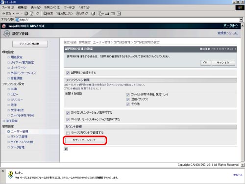 登録されている部門のカウント数を全て消去する場合は部門別ID 管理画面から[設定]をクリックしたあと、[カウントオールクリア]ボタンを押します。