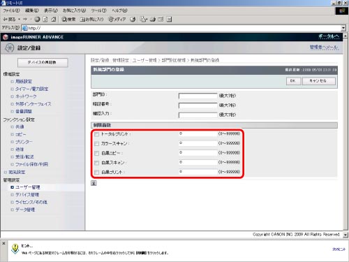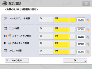 制限面数とは、部門ID毎に使用できる機能の上限を設け、その面数に達すると動作を強制的に停止する機能です。制限面数の設定は、