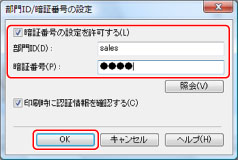 [暗証番号の設定を許可する]にチェックマークを付けたあと、[部門ID]と[暗証番号]に「本体での設定」の手順4で設定した部門IDと暗証番号を入力します。
