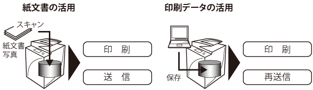 ボックス、アドバンスドボックスは、imageRUNNER ADVANCE本体からスキャンした紙文書や印刷指示を出したデータを本体内に格納し、一時保存して再利用できる内蔵ハードディスクです。